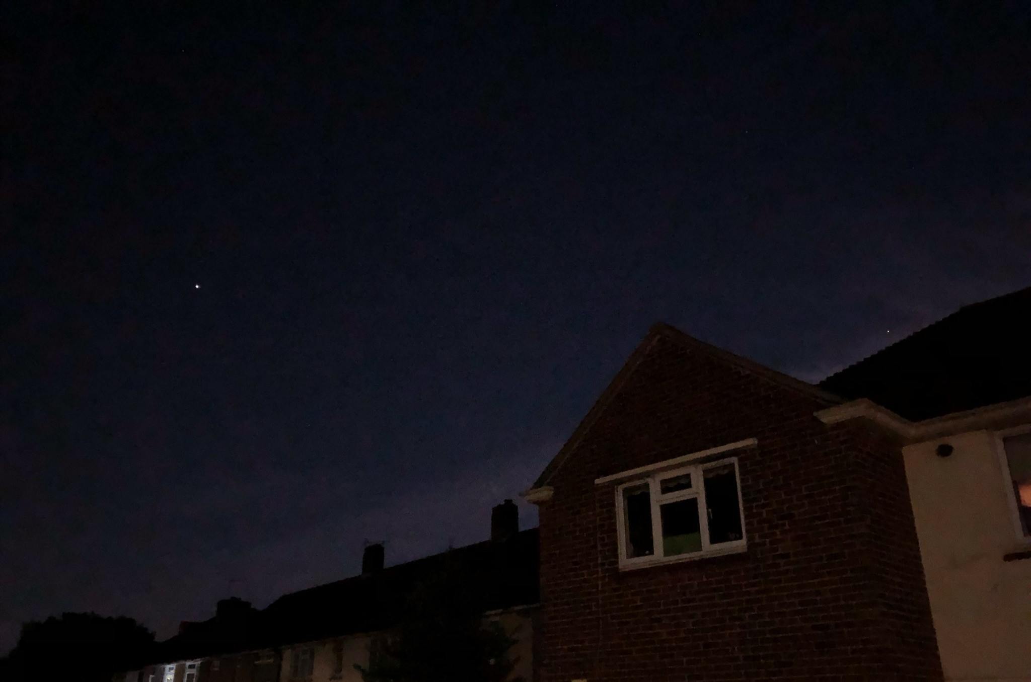 The bright star like object on the right hand side, middle is Jupiter, diagonally up, top and right is Mars and in-between at the top of the image you can just make out the Pleiades. Taken using a Canon Camera M6II on a tripod, ISO800, f/4.5, 1/2sec, 18-400mm lens set to 37mm. 02:18UTC